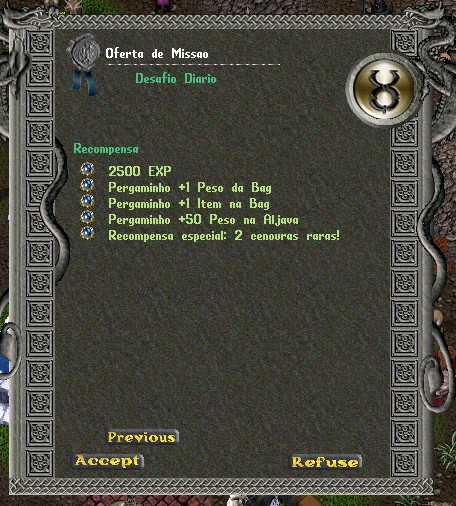• Clique duas vezes no NPC Doador de Missões e após abrir a janela, leia atentamente as instruções antes de aceitar a missão.