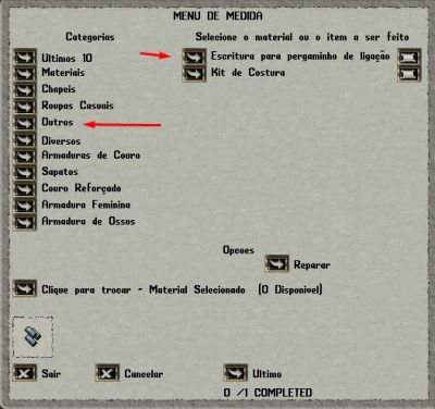 *Utilizar os recursos solicitados ao abrir o Gump (janela) da ferramenta de Tailoring, que indicará os materiais necessários para a criação. | *Utilizar os recursos solicitados ao abrir o Gump (janela) da ferramenta de Tailoring, que indicará os materiais necessários para a criação. | ||